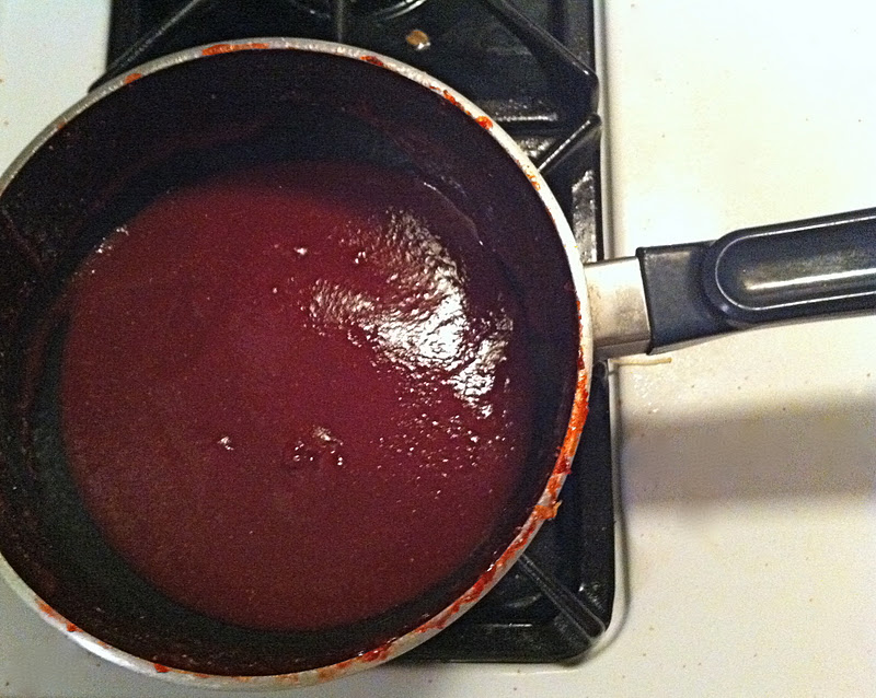 3: Once the mixture has been brought to a boil lower heat to medium low and let reduce for 30 minutes. Stir occasionally in the beginning and frequently towards the end. Mixture should look something like the photo below (sorry for the mess... cooking isn't always clean):